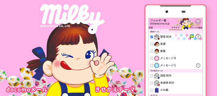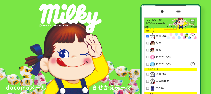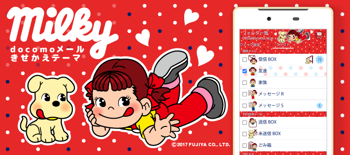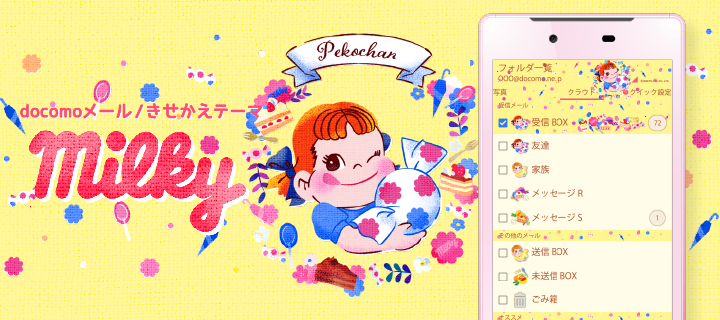 大人気!不二家「ミルキー」パッケージデザインのスタンプデコメです♪表情豊かなペコちゃんでメールを盛り上げよう!