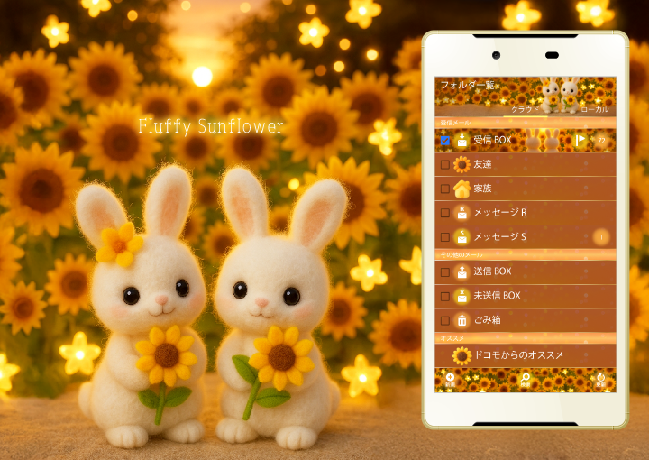 ふんわりフェルトアートのうさぎたちが、きらめく夕空とひまわりに包まれたやさしい夏のひととき。